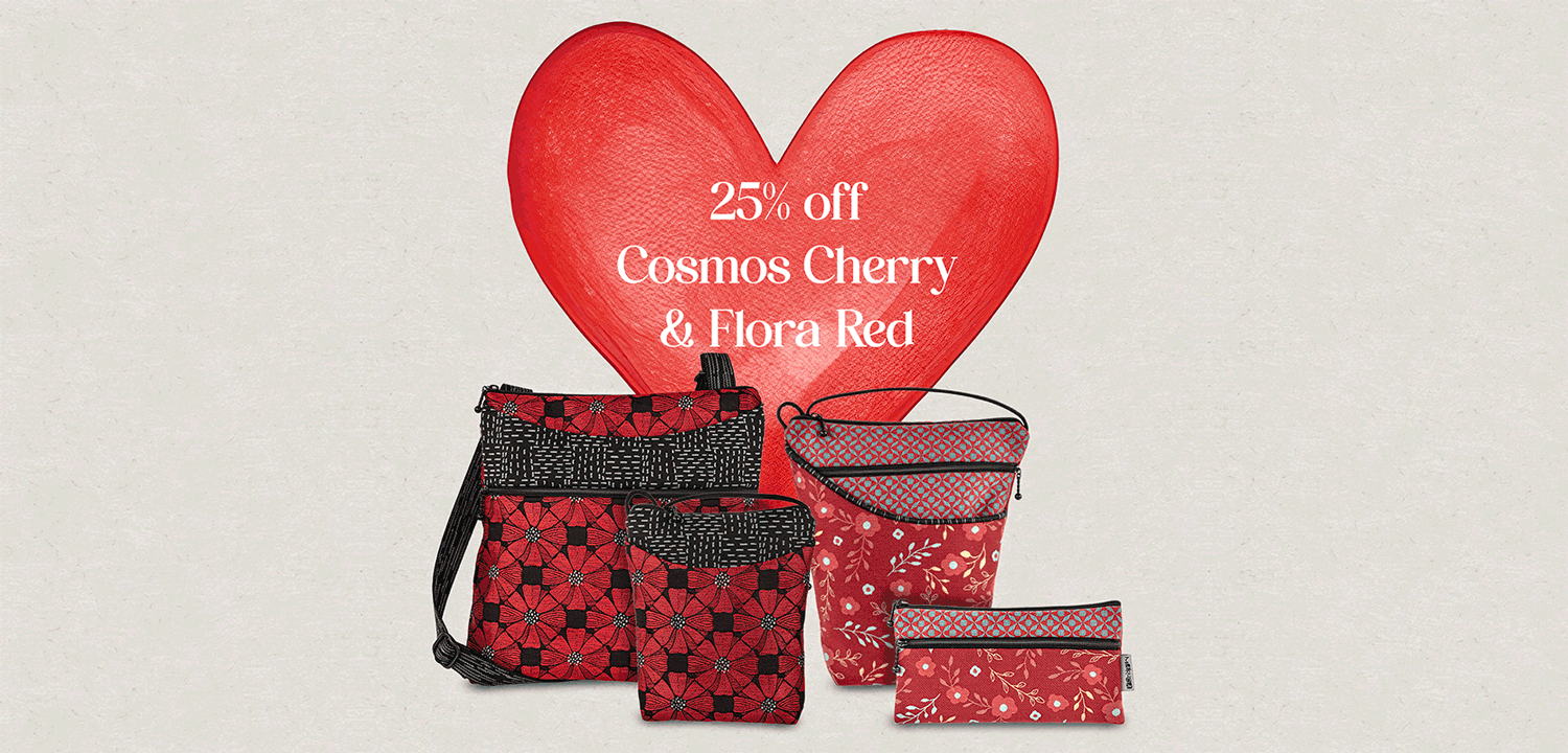 From February 3–5, enjoy 25% off our bags in Cosmos Cherry and Flora Red, two fabrics made for love notes, stolen glances, and everyday romance.