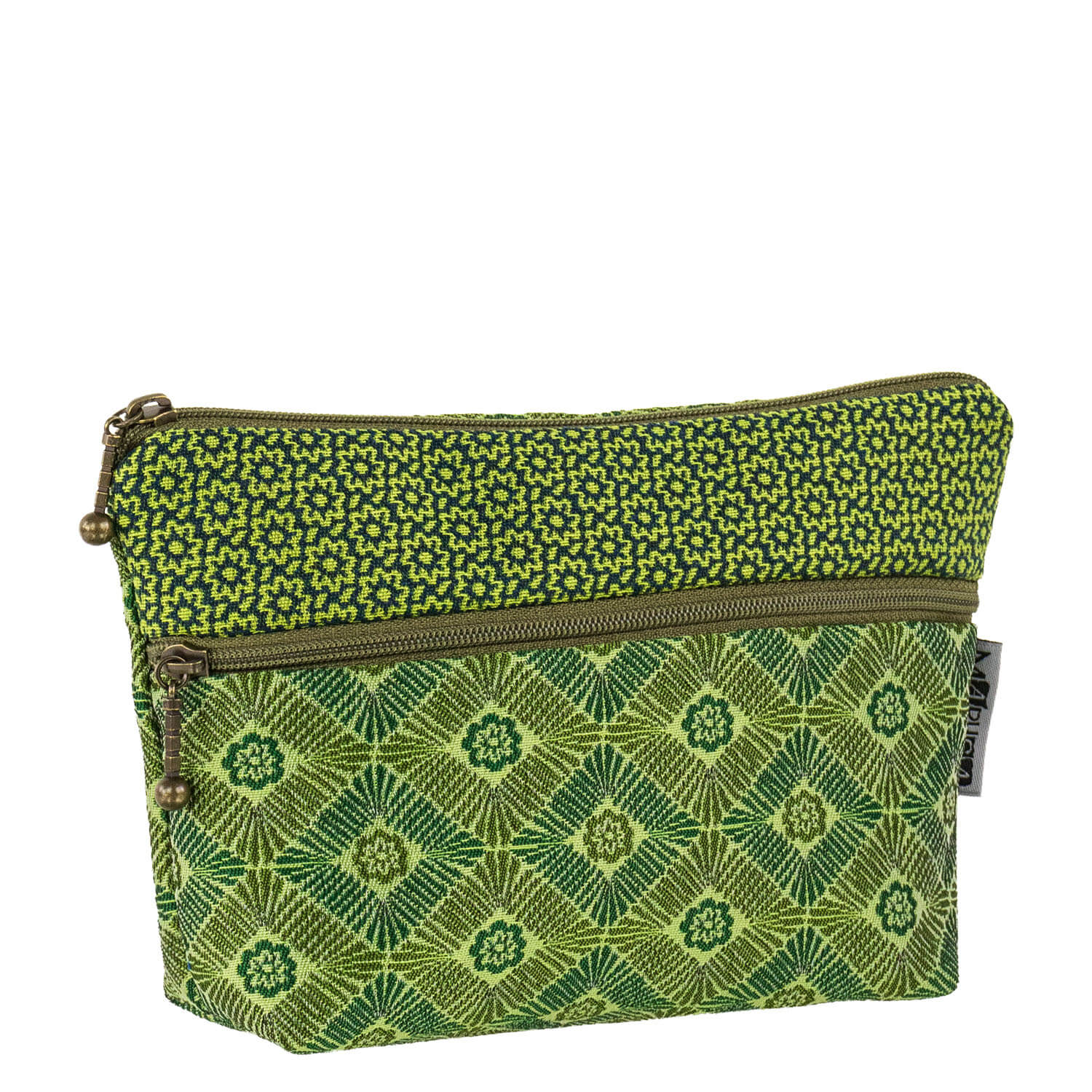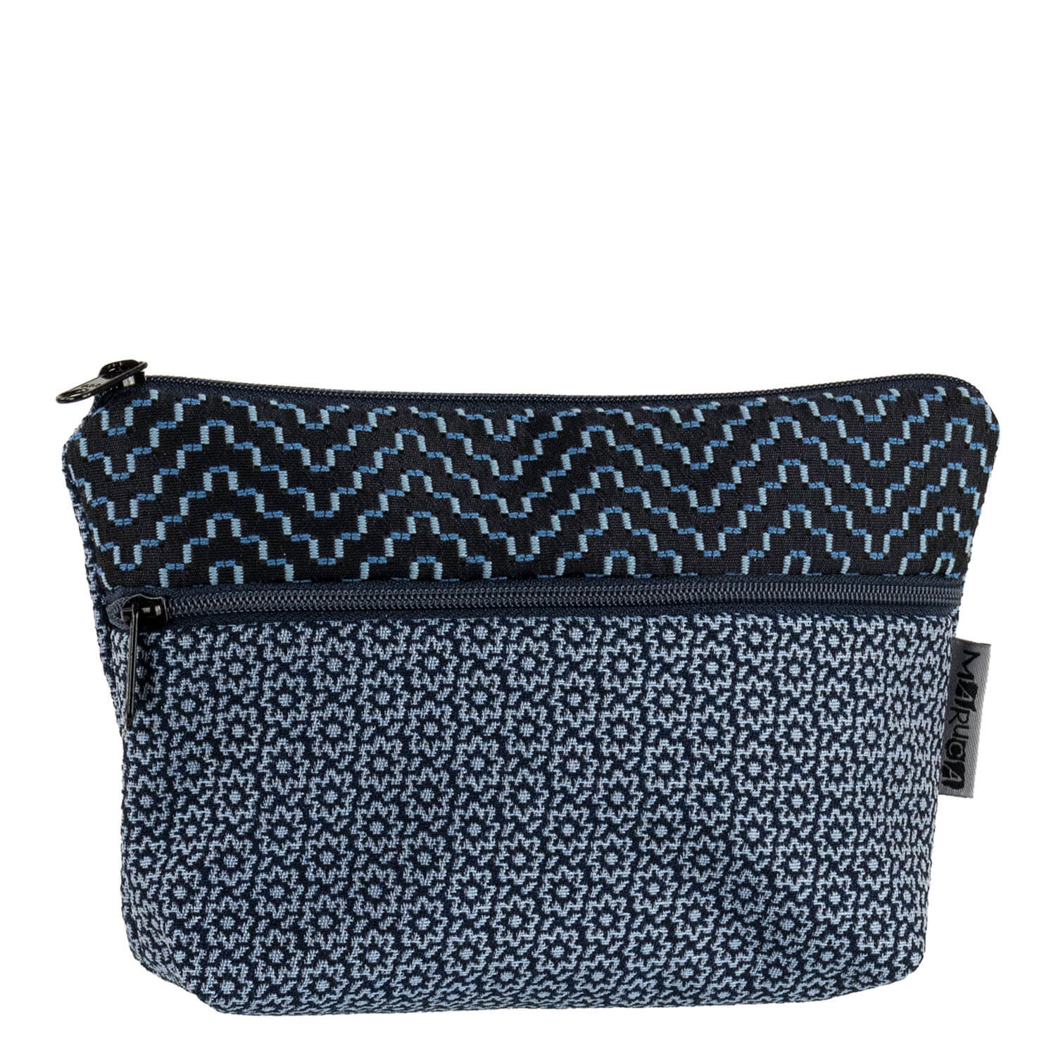 This cosmetic bag is a perfect size and has multiple uses. I am using it as a roomy wallet with space for a variety of items. The Lantana Denim fabric is a favorite.