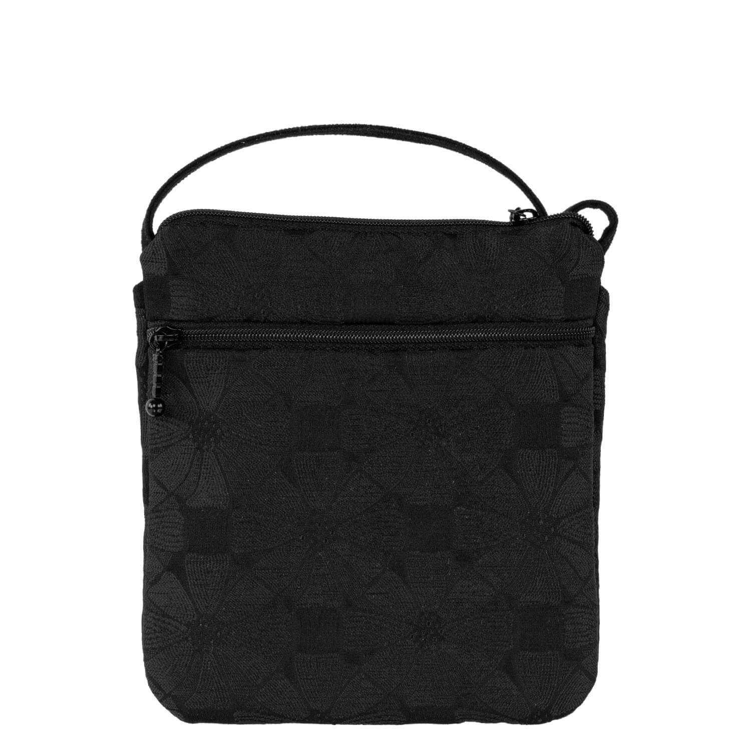 Sleek and flat design perfect for all your essentials! Main compartment with top zip, back zip pocket, and open front pocket. No boxed bottom, but the interior is lined with a wipeable, water-resistant gray liner.