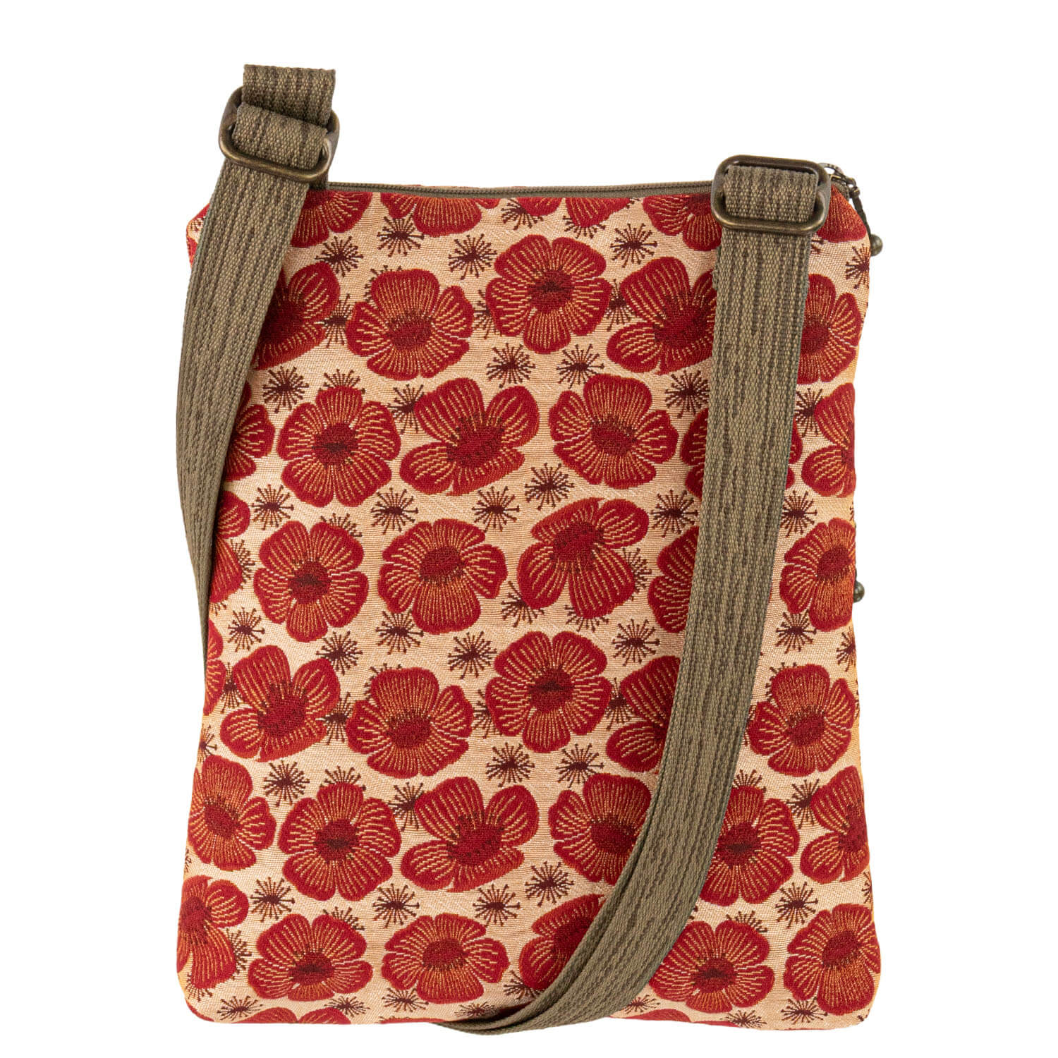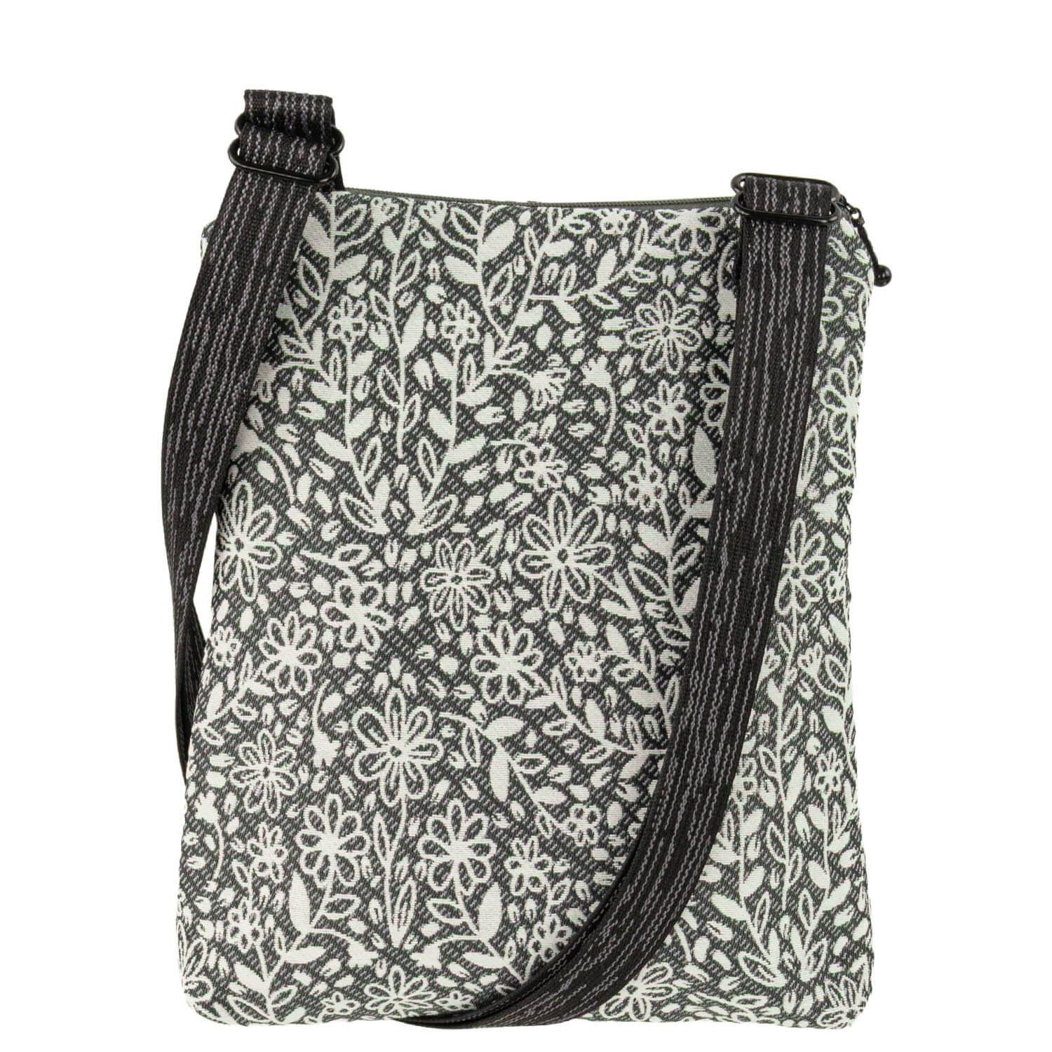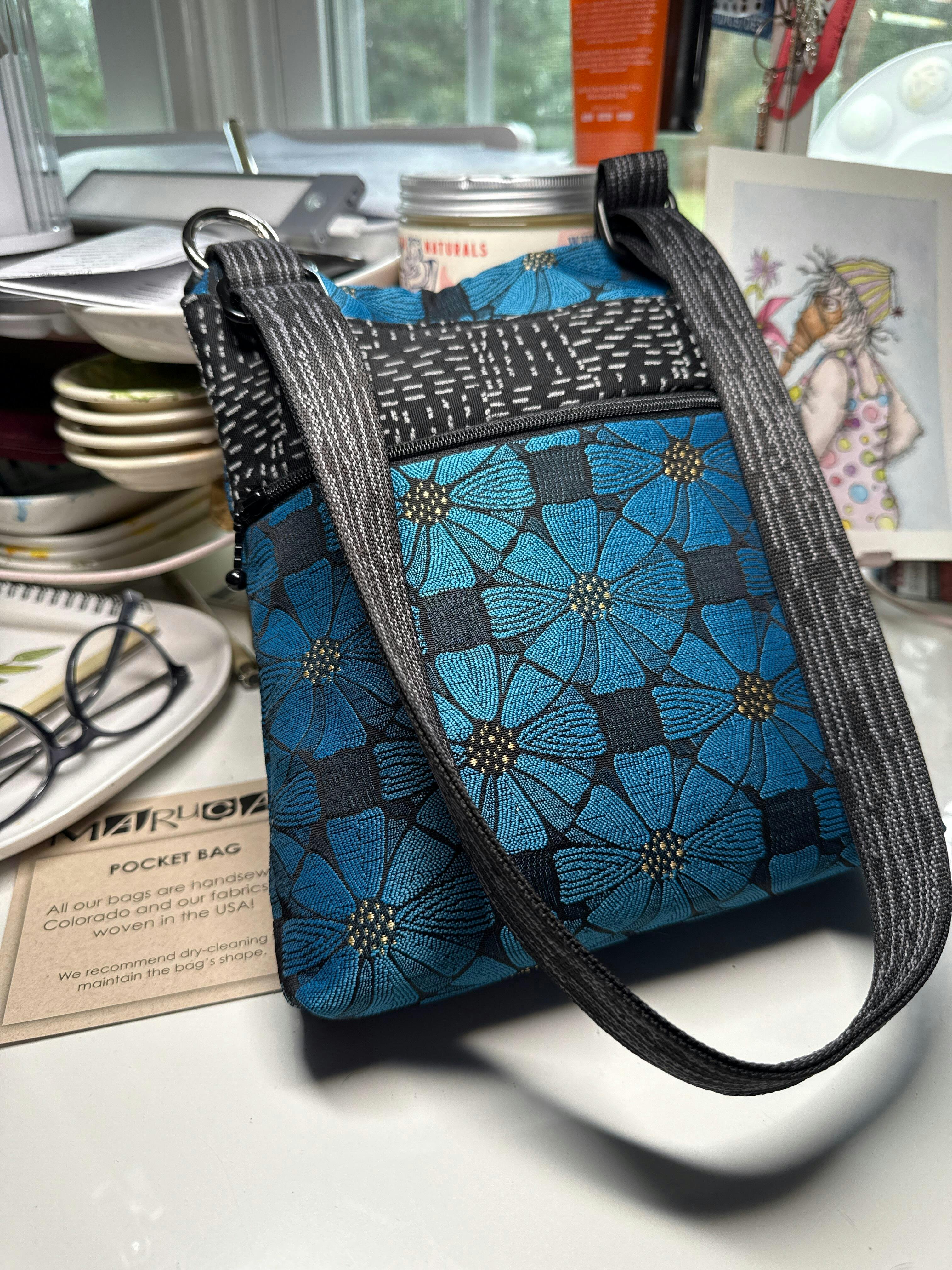 A fan favorite and a top seller! Great for traveling near or far. Adjustable 1” webbing strap. Comes with an extra little pocket inside. Main compartment zips at the top. Outside has a front pocket for easy access and a secure pocket with a zipper. Perfect for iPad Mini or e-reader.