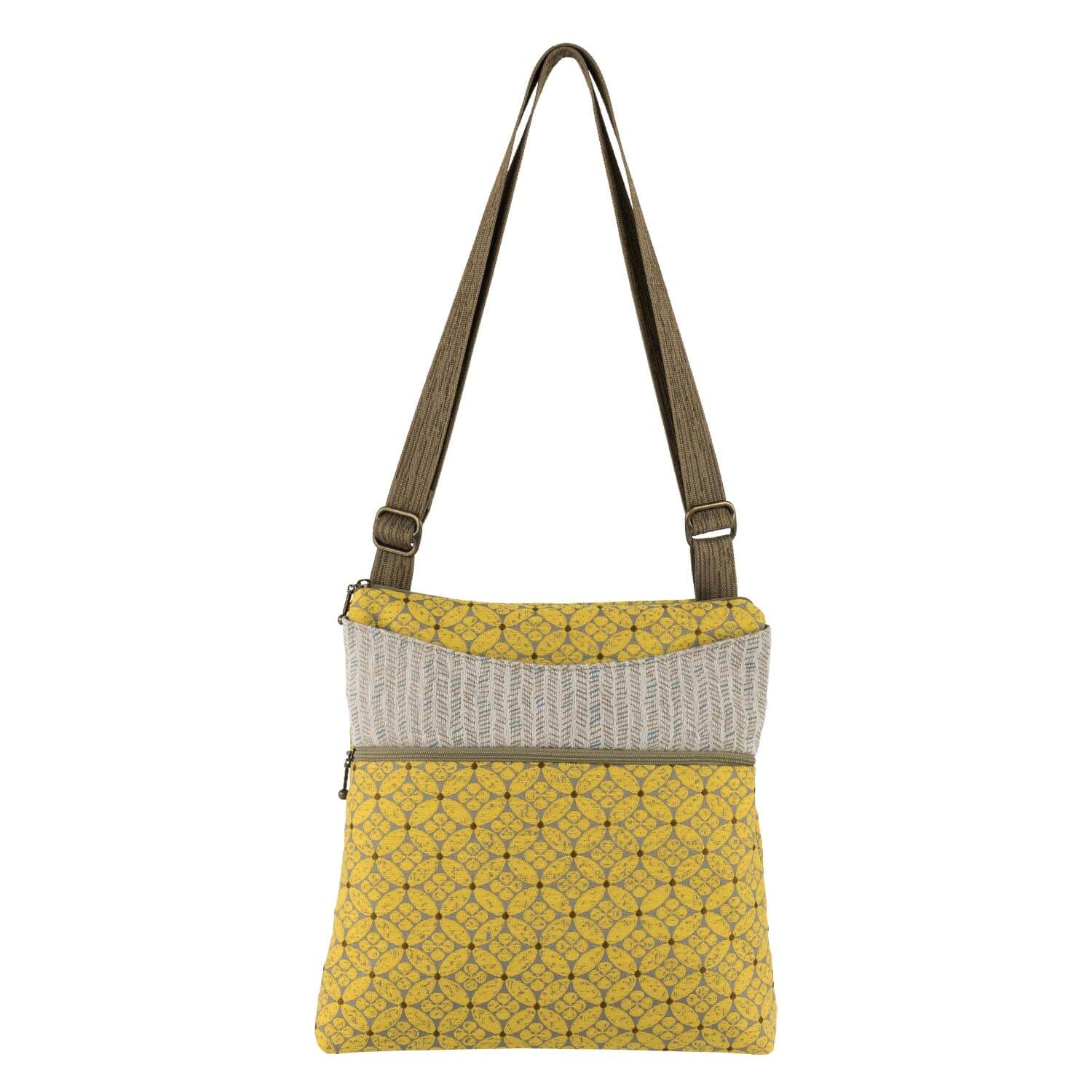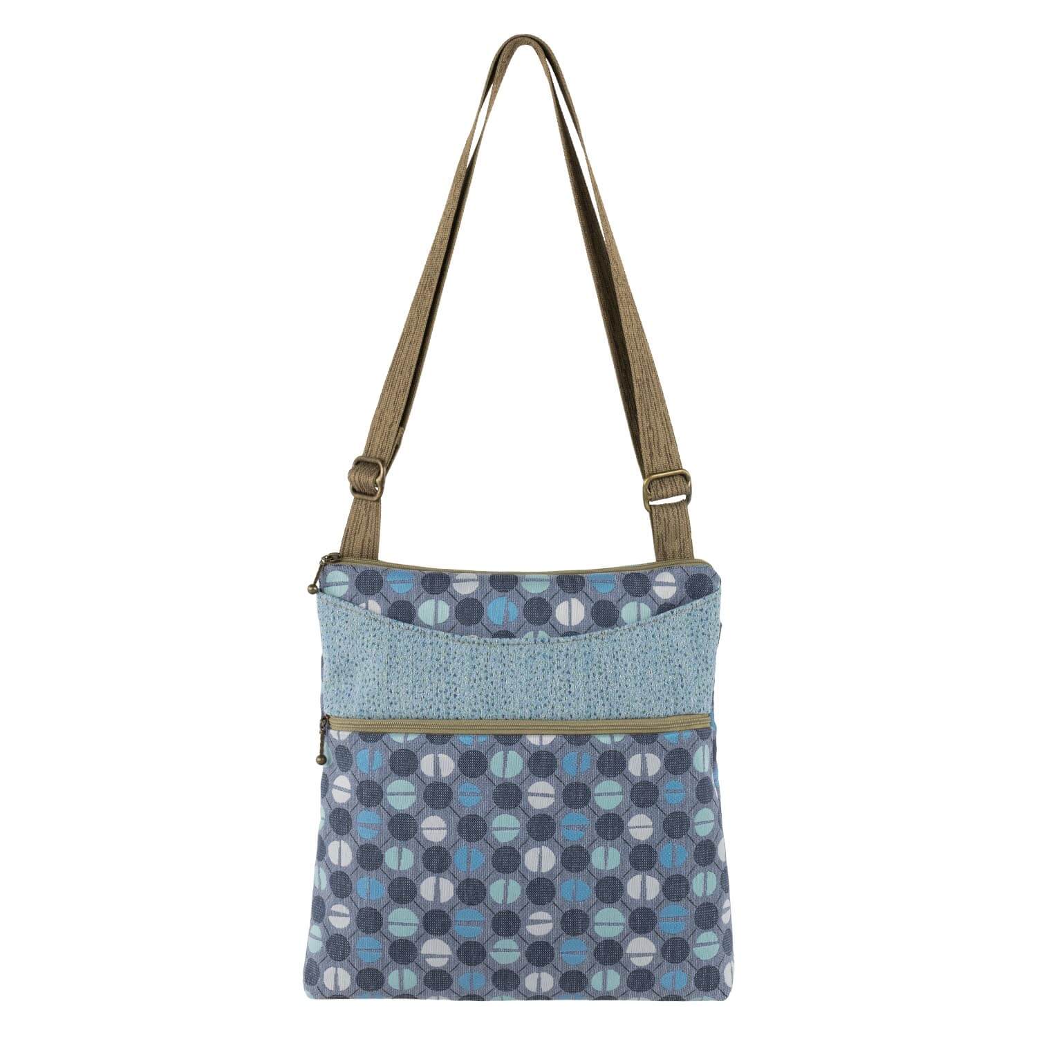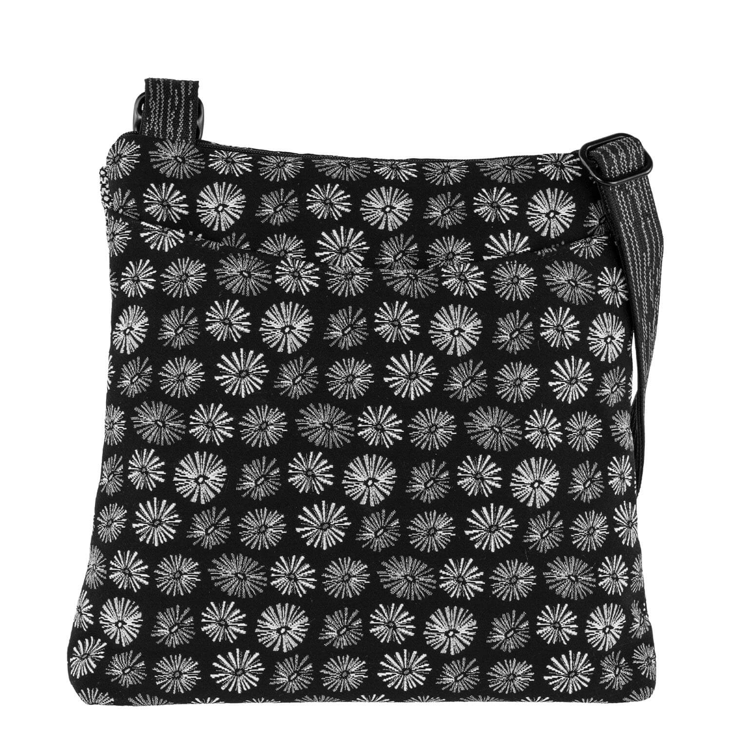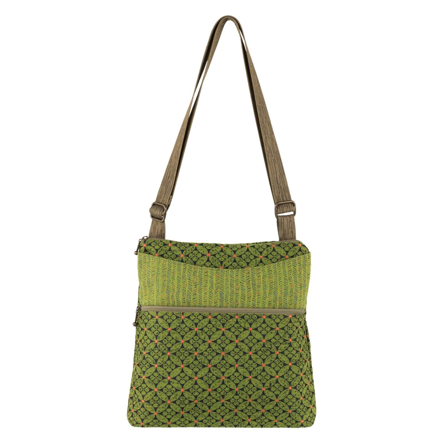 A top favorite! Adjustable 1” web strap. Main compartment has a top zipper, spacious interior, and small open pocket. Two exterior pockets - one open (6.5 inches deep) for fast access and one zipped. A generous pocket on the back holds a water bottle. The bottom is 2” boxed. This bag is fantastic!